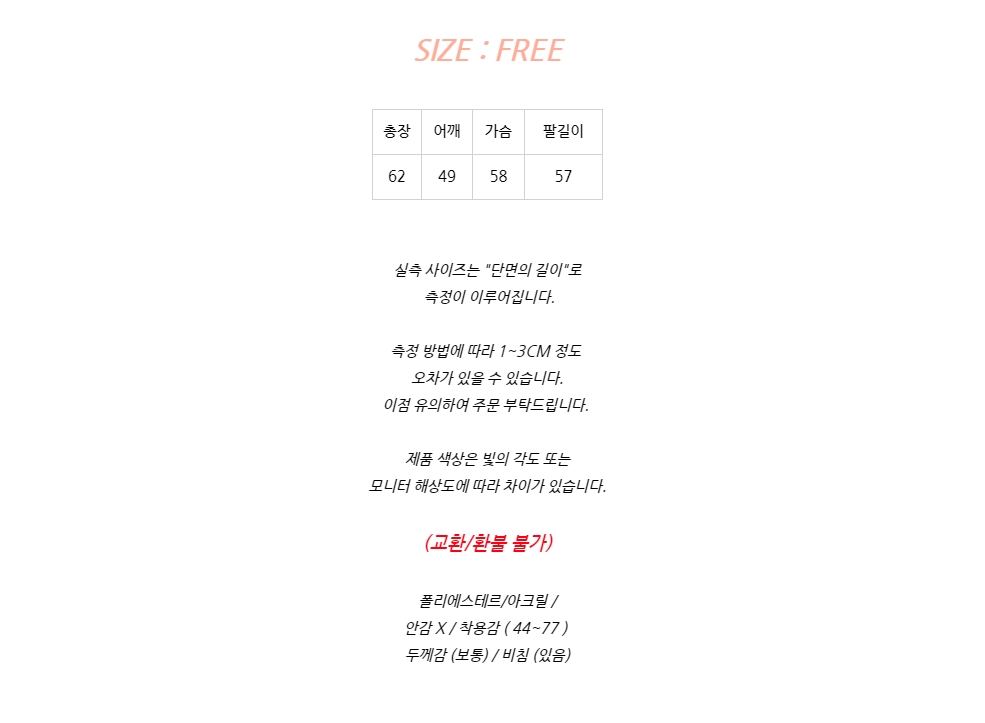 - 교환 및 반품은 상품 후령 후 7일이내 고객센터 or 카카오채널을 이용하여 교환/반품 신청 부탁드립니다.