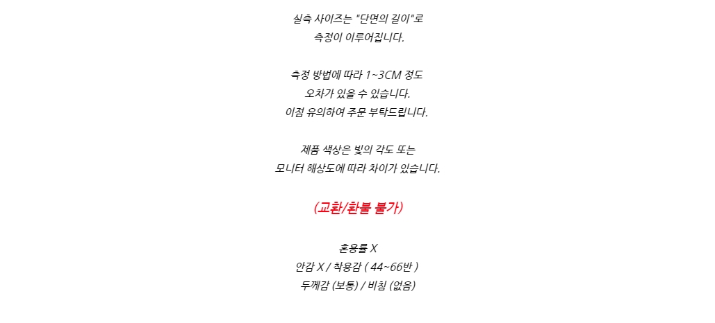- 교환 및 반품은 상품 후령 후 7일이내 고객센터 or 카카오채널을 이용하여 교환/반품 신청 부탁드립니다.